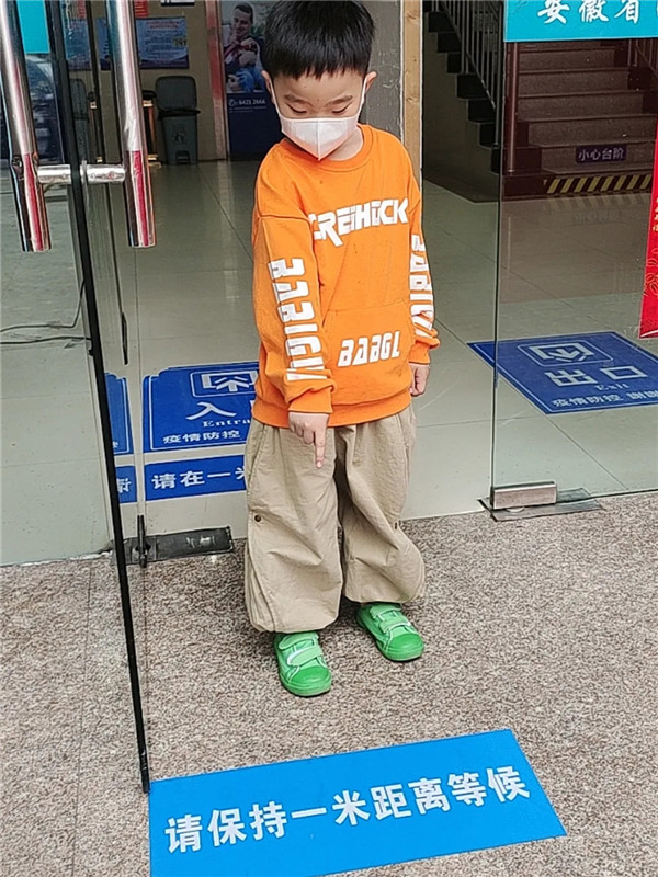 幼儿园:幼儿园门口有一米线,是整齐排队不插队,保持安全距离。