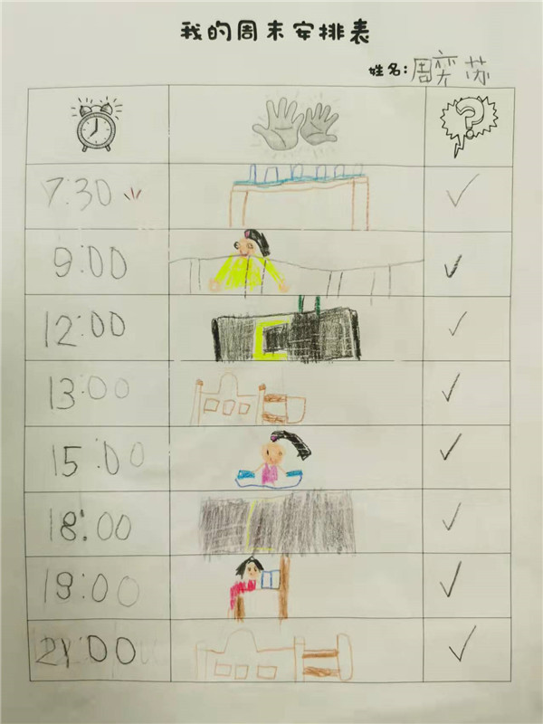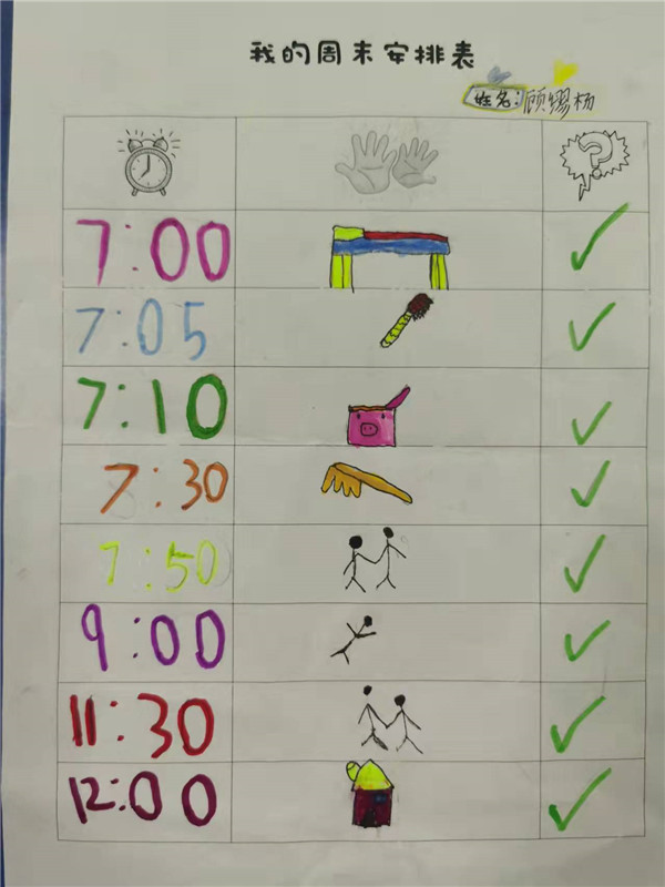 作为一名即将入学的小学生为了养成珍惜时间的好习惯,做时间的小主人,孩子们与时间定下了美丽的约定。很快时间来到了周末,我们决定为这个周末制定了周末安排表。