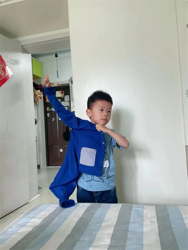 子如说: 穿卫衣就先把头套进去,找到上面的洞就可以啦!