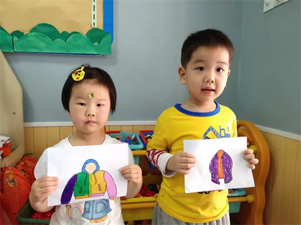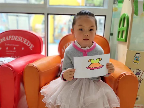 在了解了衣服的这么多相关的内容后,孩子们迫不及待的想设计出属于自己的衣服。幼儿常常把绘画当作一种游戏,涂涂、画画、贴贴深受他们的喜爱,随着兴趣任意进行。瞧,一件件衣服就设计出来啦!