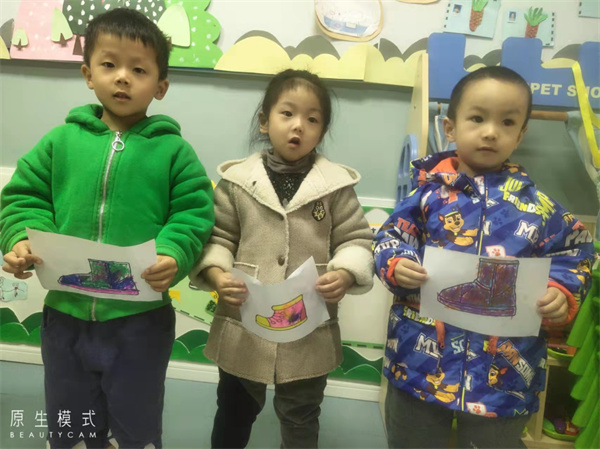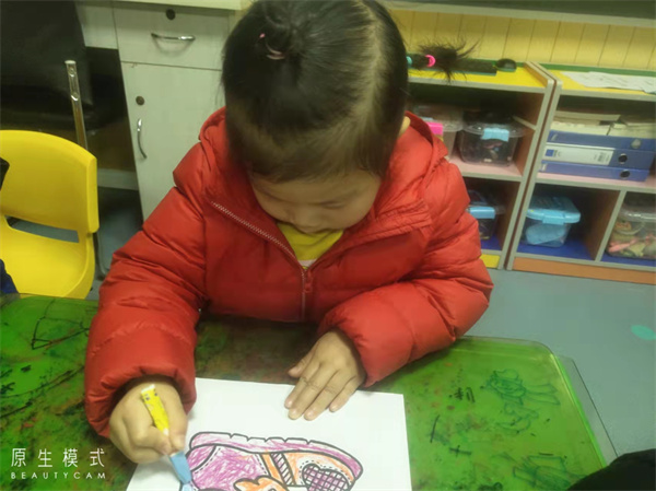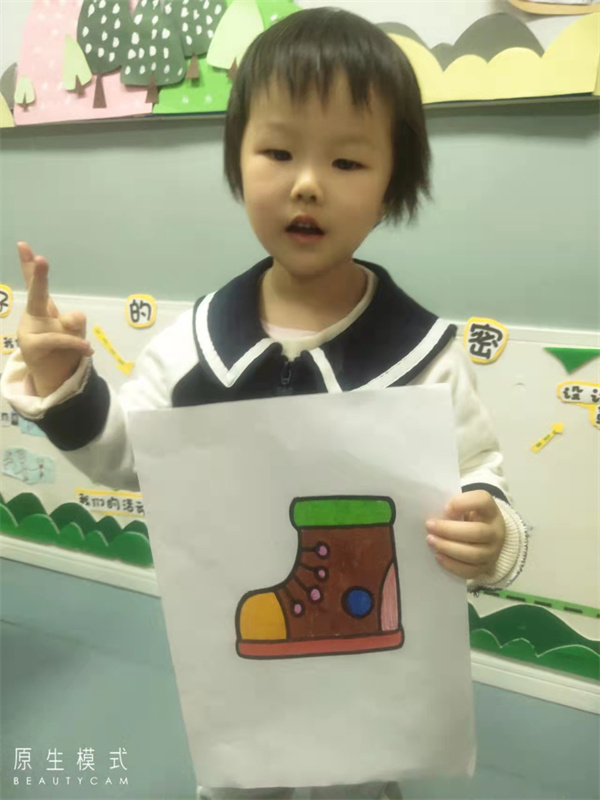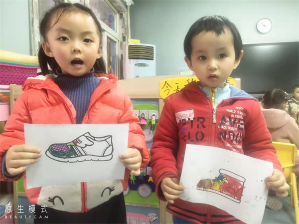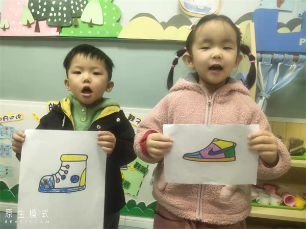 在了解了鞋子的这么多相关的内容后,孩子们迫不及待的想设计一双鞋属于自己的鞋。小班幼儿常常把绘画当作一种游戏,涂涂、画画、贴贴深受他们的喜爱,随着兴趣任意进行。瞧,一双双鞋子就设计出来啦!