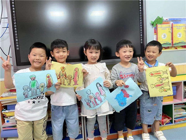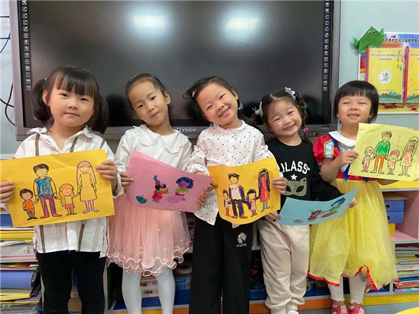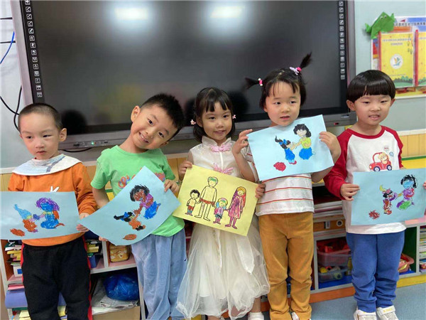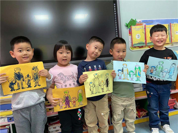 绘画活动在温情的歌声中结束,孩子们相互欣赏绘画作品,向同伴介绍自己的爸爸妈妈。