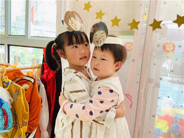 表演区内,在熟悉了绘本故事形象以后,班上的果冻和涵涵自主的扮演起了故事角色“春奈”和“妈妈”,两个人抱在一起,互相说着100次我爱你。