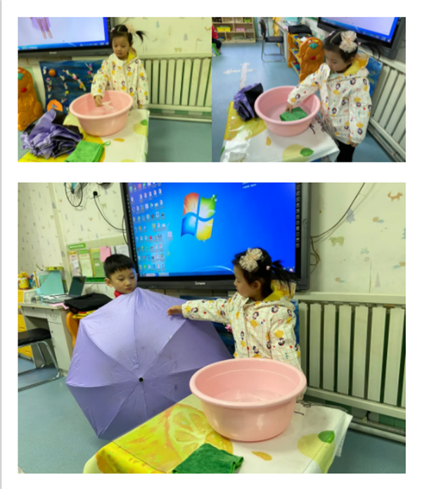 孩子们小小的脑袋,大大的疑惑,思考雨伞不漏水和雨衣的防水性,觉得很神奇。《指南》科学领域目标提出:“在探究中认识周围的事物与现象”。孩子是天生的探索家,于是,直接现场,调动孩子们的多种感官,我们开始探究雨伞的秘密。
