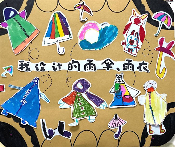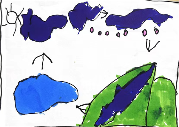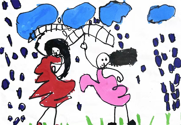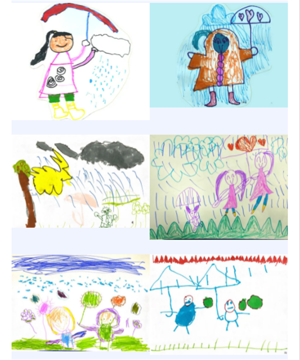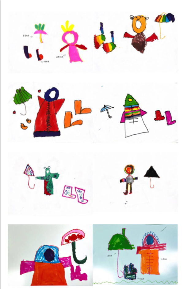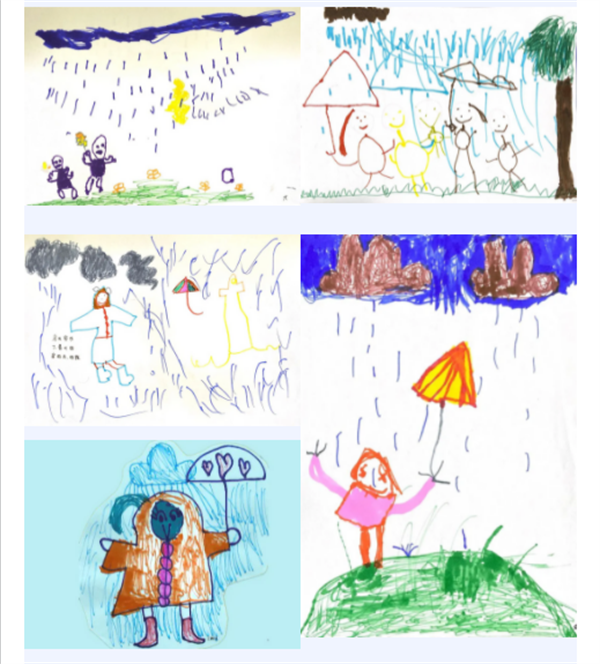 孩子们对雨天情有独钟,提议画一幅雨天的画。雨中嬉戏、漫步,好不热闹。有的天马行空,甚至把乌云罩在自己的伞下。小蚂蚁举着树叶挡雨,充满童趣,十足可爱。
