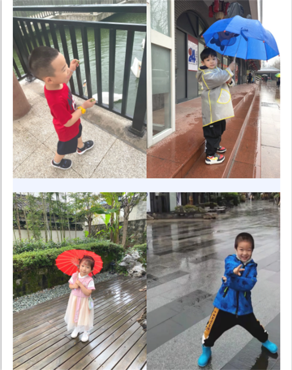 孩子们喜欢自然中的一切事物。他们对雨产生兴趣,调动各种感官去感知、开展多种游戏去体验。绽放其自由自在的“游戏力”,自主成长的“生命力”。