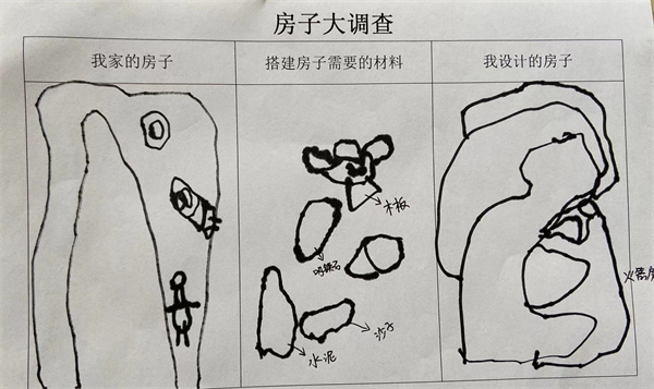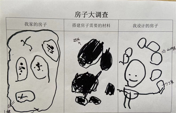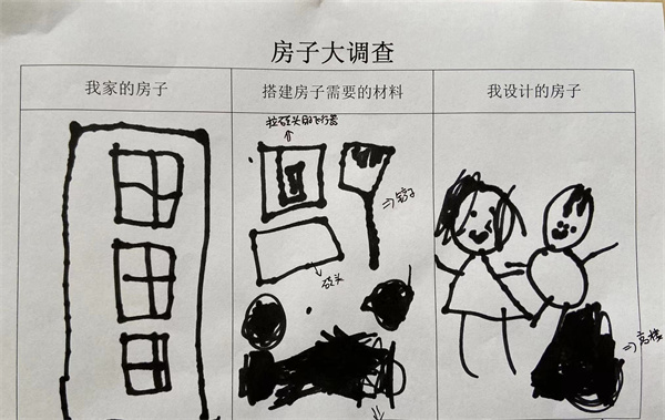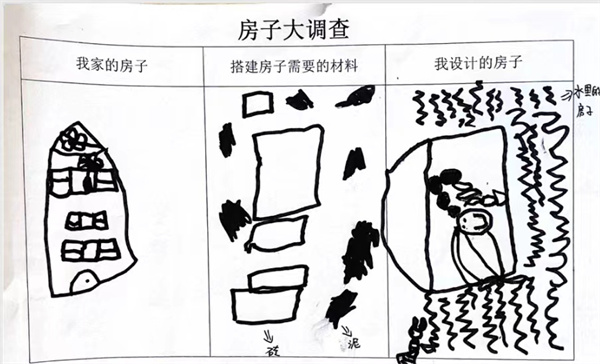 基于幼儿生活经验,从幼儿最熟悉的房子入手,幼儿描绘出自己家的房子,再思考房子需要的材料,最后设计出房子,将自己想要搭建的房子画出来。