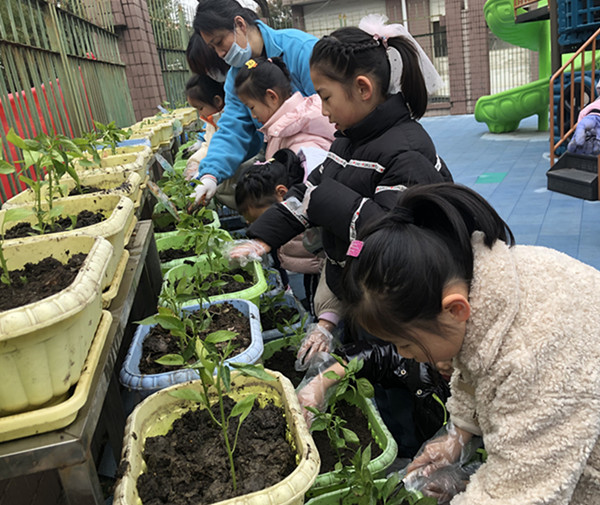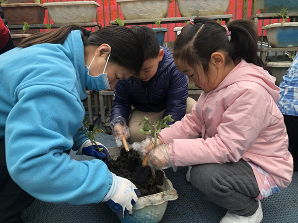 在活动中,教师向幼儿生动形象地讲述树木对于人类的重要作用,学前班的孩子们来到种植区,拿着自己的工具,小心翼翼的把小树苗带到自己认为最适合小树苗生长的地方,挖坑、栽种、填土、浇水,一步步的工序——孩子们用充满爱心和责任心的行动表达着他们对花草树木的爱护和祝福。