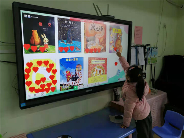活动初期孩子们通过大量倾听和自主的阅读有关“同伴之爱”的绘本作为幼儿前期经验。投票活动中教师为了让每一个幼儿都参与其中,在全班幼儿的共同见证下,孩子们都很认真的将自己手上宝贵的一票投给自己最喜欢的绘本故事。并说出自己喜欢的理由:“《小鸡球球和星日葵》中小鸡和球球之间很友爱”“小鸡球球和向日葵像我和我的好朋友妞妞”。最终《小鸡球球和向日葵》以最高票成为幼儿最喜欢的绘本。
