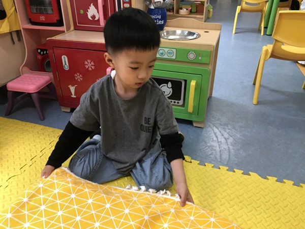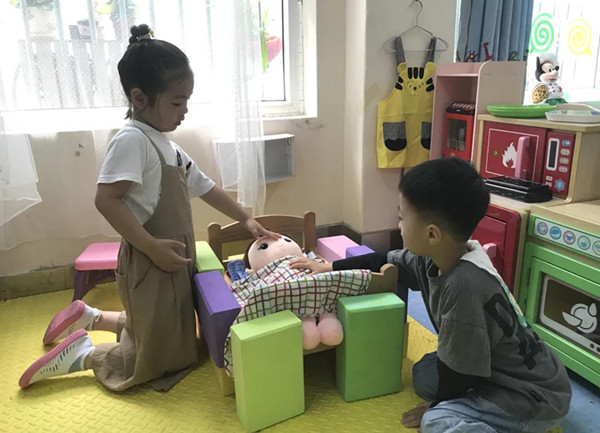 在游戏中,幼儿扮演着自己喜欢的角色,“宝宝”午睡的时间到啦,“爸爸”、“妈妈”和“哥哥”开始陪伴“宝宝”入睡了,这时“妈妈”突然发现“宝宝”翻身会不小心掉下来的,怎么办呢?“哥哥”想到了一个好办法,“我们可以给宝宝做一个保护栏!”他们在建构区寻找了好多材料,不仅给“宝宝”搭建了保护栏,还搭建了一个空间大一点的床哦!“爸爸”和“哥哥”把积木框当做餐桌,铺上桌布,摆起了食物,看起来很合适呢!“爸爸”和“哥哥”非常热情的招待“小客人”。幼儿尝试着在角色游戏中扮演各种不同的角色,和同伴一起协商,随着幼儿生活经验的积累,体验的增加,游戏情节也更加丰富了。