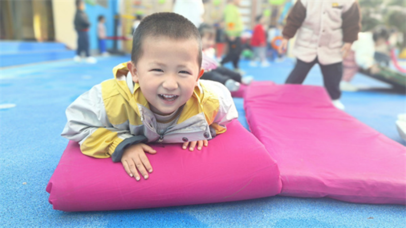 第一次拿到垫子这个“新玩具,大家忍不住赶紧来试试。在游戏中,垫子除了可以保护的安全,它还可以玩呢!根据小班幼儿已有的生活经验,初次探索中,孩子们在一遍遍垫子“垒起来”和“打开拉长”的基本外形中,探索向上爬、向下纵跳、双脚跳、滚、手膝着地爬等不同的垫子玩法。兴趣是幼儿不断探索游戏的内驱力,在自主探索中,多样的玩法,激发了小班宝贝游戏的欲望。