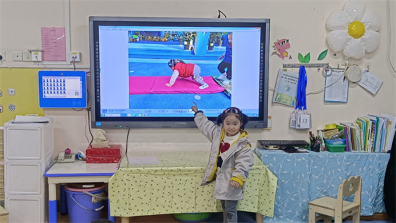 初次探索后,老师抓住孩子们关于“爬”和“跳”的游戏兴趣点,通过观看游戏视频和照片,大家相互分享着自己的游戏。
