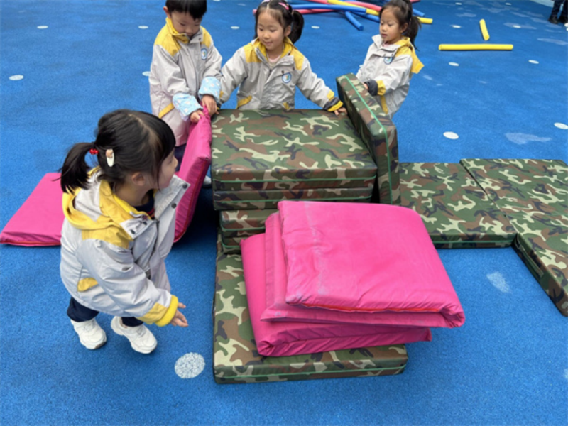 普通的垫子在孩子们持续的探索中玩出了大大的乐趣。随着对垫子材料特性的了解,大家的想法更加大胆,他们尝试使用垫子变形、各种组合、连接,不断激发着孩子们探究的欲望。其中,孩子们也遇到了一些问题,他们会尝试想办法或寻求老师的帮助。我们也发现:放手,给予幼儿充分的时间探索,让孩子的游戏更加自主,更有自己的想法,同时,语言表达、同伴交往以及初步解决简单问题的意识都在小步发展。