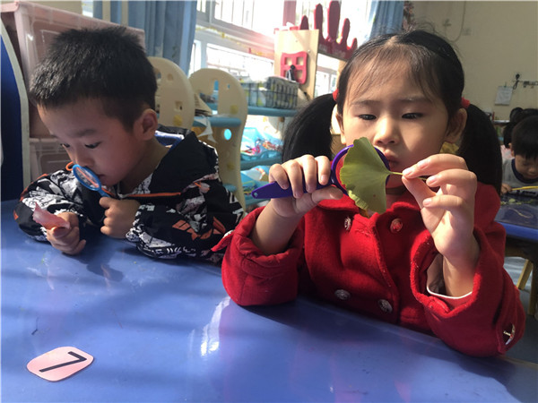 捡到树叶之后小朋友们将落叶拿到教室后,小朋友们迫不及待地拿起放大镜,认真观察小树叶的模样,真像一个个小小科学家。通过和小朋友共同探究知道:叶子的颜色有很多种,大小不同,形状不同,叶子上面的长线线叫叶脉,叶脉的形状也不一样,有的是细细长长的,有的短短的,叶子上的花纹也不一样。