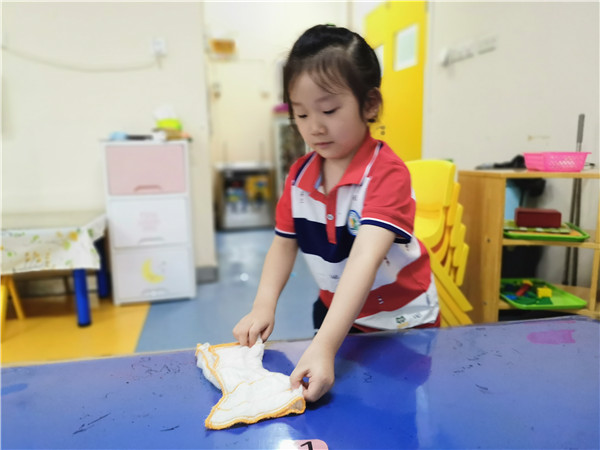 值日生可以摆放水杯、擦桌子、挂毛巾、整理图书和玩具······每一位值日生不仅成为了老师的能干小帮手, 也是小朋友们的贴心服务者。