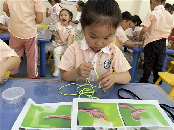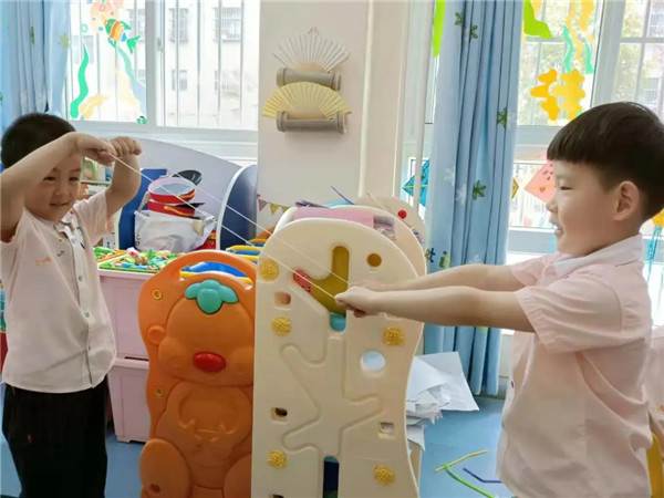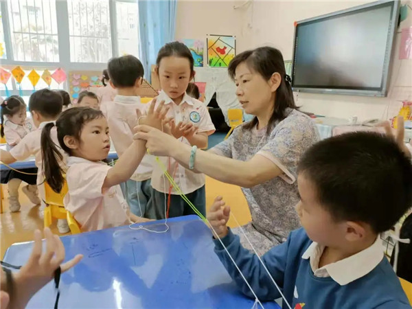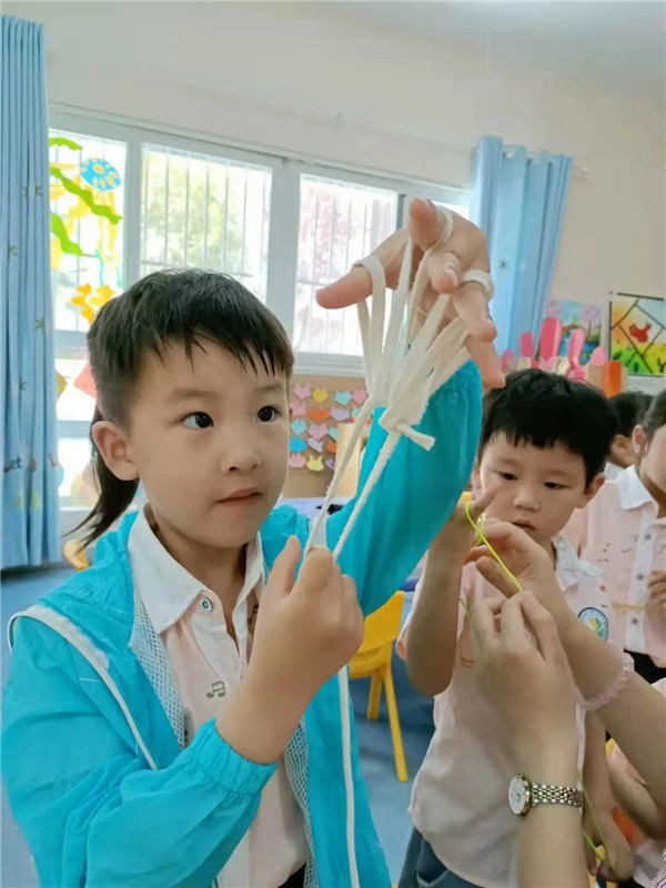 区域活动时,欢欢小朋友在美工区游戏的时候发现了一筐粗细不同、长短不一的绳子,她用剪刀裁掉一截埋头摆弄着,乐乐好奇的问道:“你在干什么呀,”欢欢回答道:“我在做‘翻花绳’的绳子。”一场奇妙的翻花绳游戏就此展开……