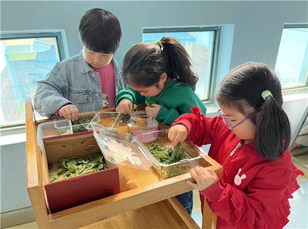 孩子们从“如何饲养好蚕宝宝”的问题出发,孩子们通过发现、猜想、观察、讨论、验证等方式,获得关于蚕宝宝“蚕宝宝喜欢吃嫩嫩的桑叶”生活和饮食方面的习性特点。随着蚕宝宝一天天长大,孩子们每天早上耐心、细心地帮蚕宝宝换桑叶,无微不至地照顾着蚕宝宝。