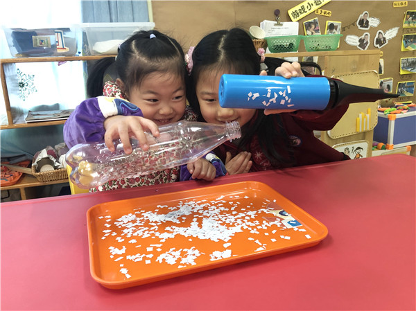 基本了解静电后,孩子们开始做起了小实验。孩子们从活动室里搜罗了许多的材料,进行了“电吸纸屑”小实验。 在实验中,通过加大摩擦力度,孩子们发现摩擦时间越长,力度越大,产生的静电就越强,吸到的小纸屑就越多。孩子们在观察、探索、猜想的过程中,找到了各种各样的材料,在尝试多种材料后,通过表格方式进一步巩固了解哪些材料能产生强静电,哪些材料不能产生强静电。最后得出结果:原来通过塑料制品经过摩擦最容易产生静电,所以能顺利吸起纸屑。