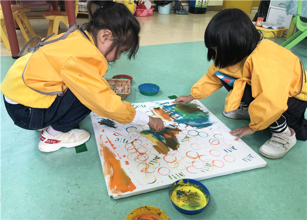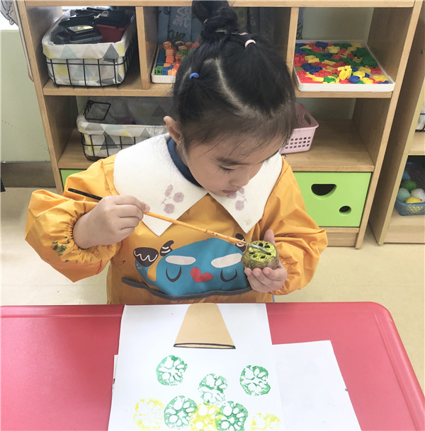 活动前期,教师组织幼儿开展《蔬菜变魔术》的主题美术活动,激发了幼儿对“拓印”游戏的兴趣,拓印过程中,涂一涂,蘸一蘸,按一按颜料宝宝,它们就跑到画纸上。为了能让自己留下更多的“印记”,孩子们乐此不疲,感到新奇又好玩。有趣的现象立刻吸引了宝贝们的兴趣,激发了他们探索的欲望。师幼一起寻找更多的拓印材料,开启了一场特别的拓印游戏之旅!