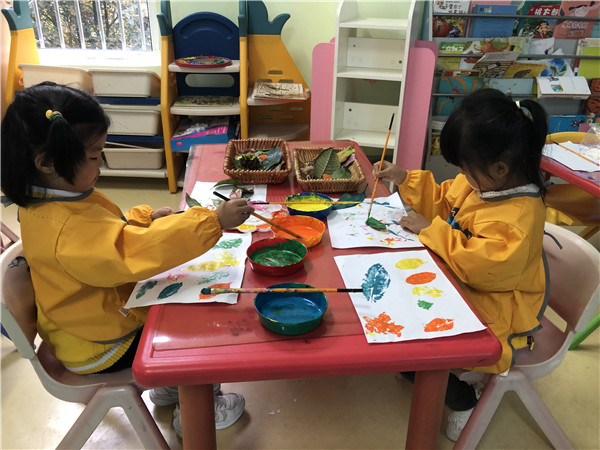 玩具、废旧材料,平平的,方方的,都有属于自己的印记,那树叶宝宝是不是也有呢?基于前期的生活材料拓印经验,孩子们萌发了用树叶拓印的想法。第一次的尝试之后,孩子们发现自己拓印的树叶并不能完全出现在画纸上,有的只有一点点的轮廓,因为每一片树叶的软硬和纹路都是不同的,有的太硬会翘起来,有的平平的,就容易上色。教师在活动中鼓励幼儿积极思考解决问题。增强了孩子们对生活的感知能力,同时在拓印的过程中,锻炼了孩子们的手脑协调能力。