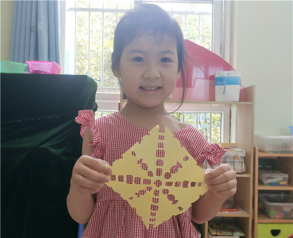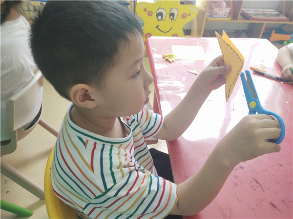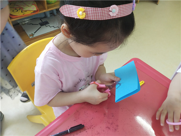 小朋友们开始了他们的第一次尝试,但是也遇到了很多的问题。“为什么我剪的变成了两个小的呢?”“我的图案画在纸中间了,应该怎么剪呢?”在老师的提示和自己的努力探索下,小朋友们终于知道了设计剪纸时要注意沿着对折线,这样剪出来的图案才会连在一起,图案也要画得大一些,因为太小和太复杂的图案都不好剪。