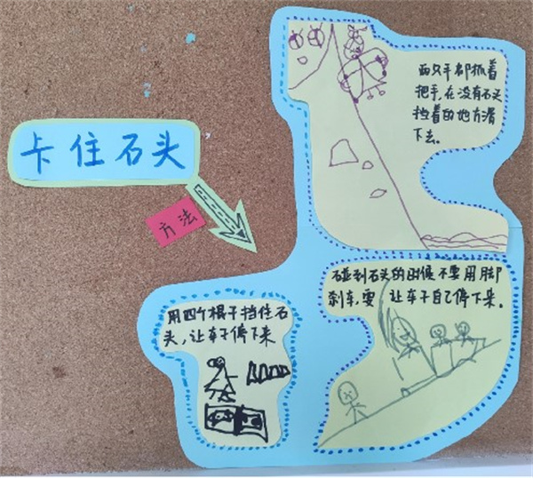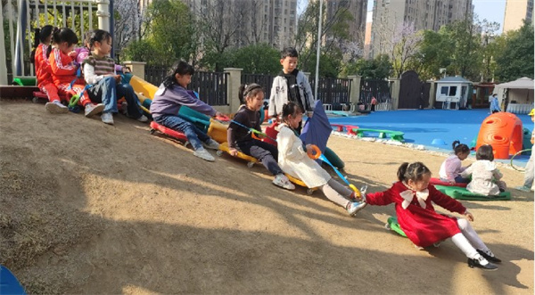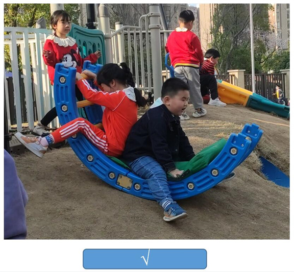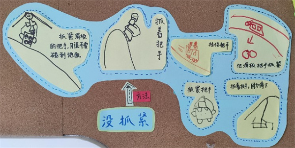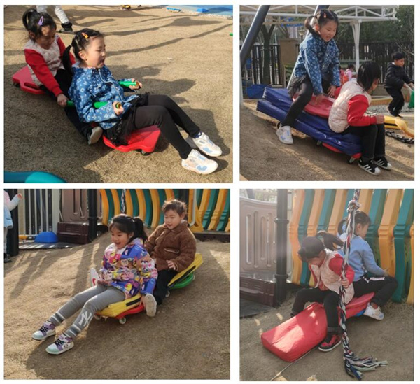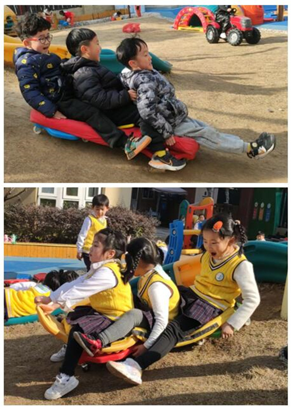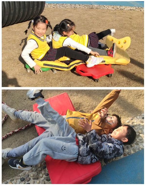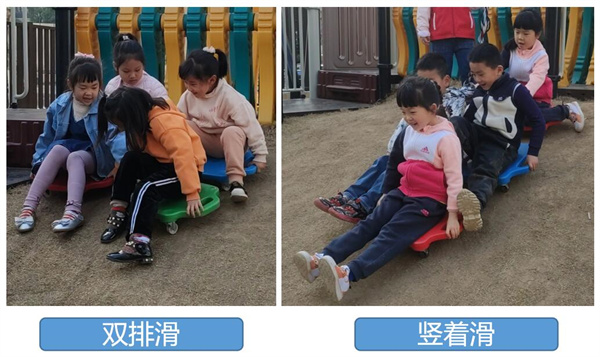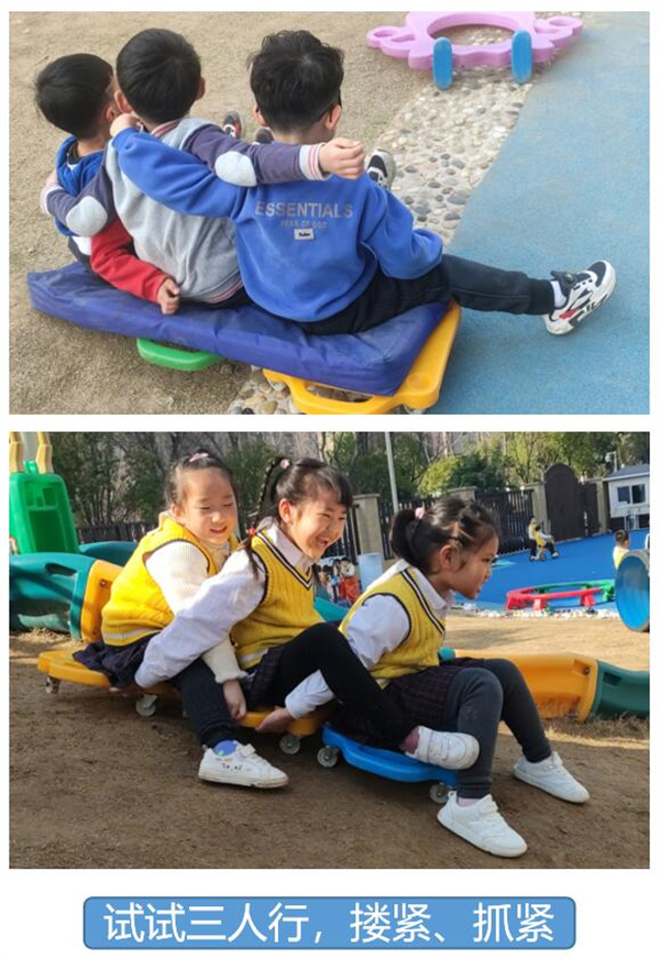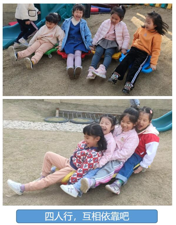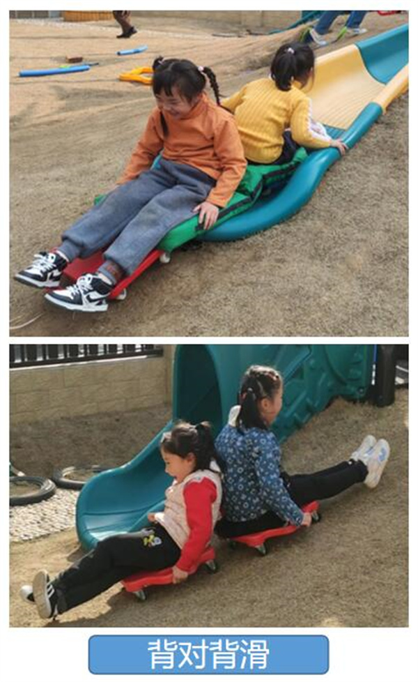 而在探索解决翻车问题的过程中,孩子们的滑行游戏开始更加注重合作性,因为游戏中的感受让他们了解到同伴互相帮助比一个人更有力量,通过和同伴合作,依靠身体与身体、手部与滑板等肢体或材料之间紧密的连结以及通过口令配合滑行的启动等,孩子们不仅掌握了稳稳地滑下来的方法,而且还和同伴之间彼此信任、共同商量、一起执行,建立了深厚的情感,切实了提高了合作意识与能力,更收获了成倍的成就感、满足感与快乐。