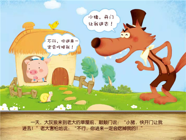 一天,大灰狼来到老大的草房前,敲敲门说:“小猪,快开门让我进去!”老大害怕地说:“不行,你进来一定会吃掉我的!”