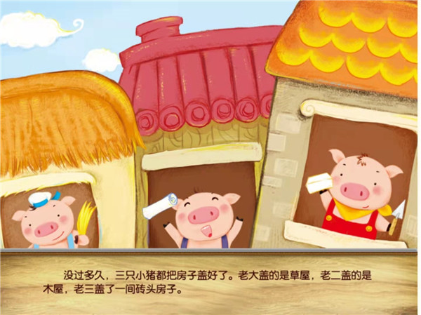 没过多久,三只小猪都把房子盖好了。老大盖的是草屋,老二盖的是木屋,老三盖了一间砖头房子。