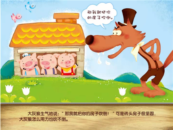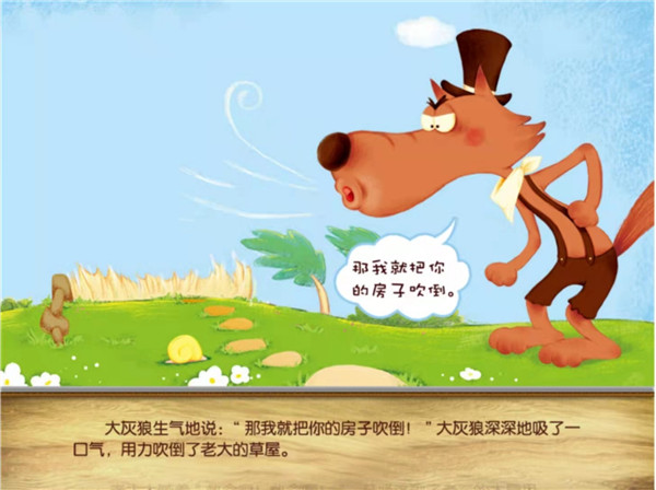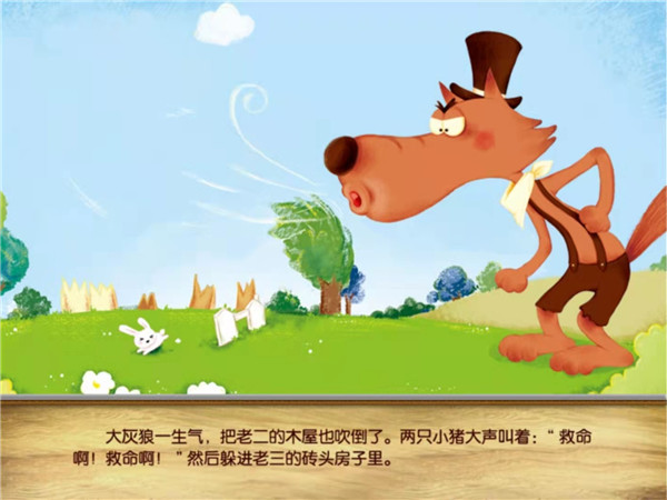 大灰狼一生气,把老二的木屋也吹倒了。两只小猪大声叫着:,“救命啊!救命啊!”然后躲进老三的砖头房子里。