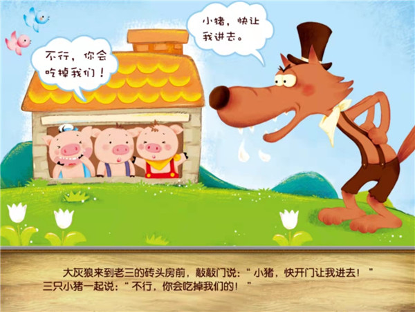 大灰狼来到老三的砖头房前,敲敲门说:“小猪,快开门让我进去!”三只小猪一起说:“不行,你会吃掉我们的!”