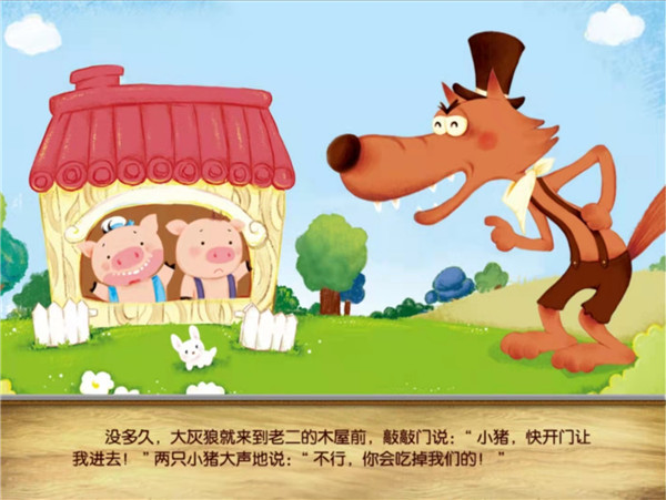 没多久,大灰狼就来到老二的木屋前,敲敲门说:“小猪,快开门让我进去!”两只小猪大声地说:“不行,你会吃掉我们的!”