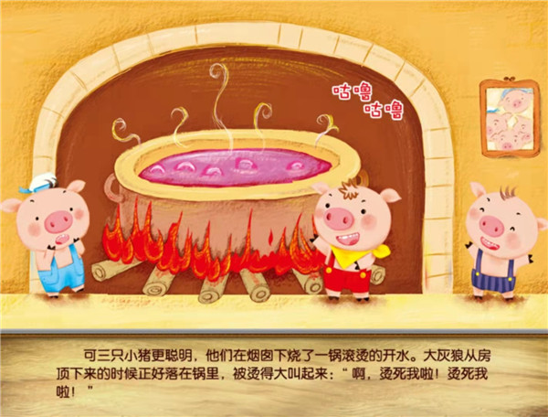 可三只小猪更聪明,他们在烟囱下烧了一锅滚烫的开水。大灰狼从房顶下来的时候正好落在锅里,被烫得大叫起来:“啊,烫死我啦!烫死我啦!”