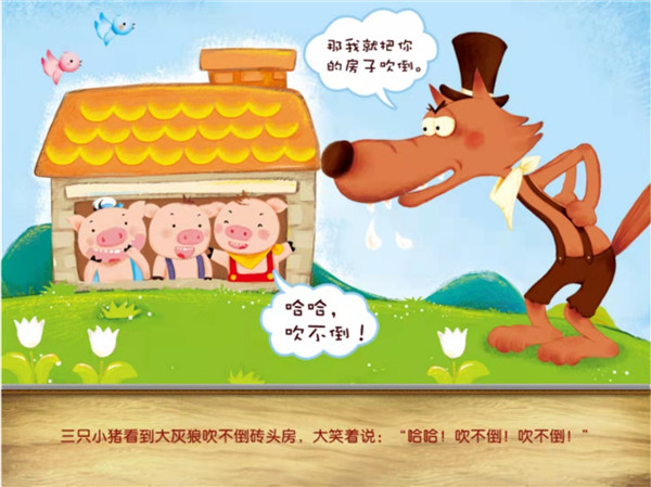 大灰狼生气地说:“那我就把你的房子吹倒!”可是砖头房子很坚固,大灰狼怎么用力也吹不倒。