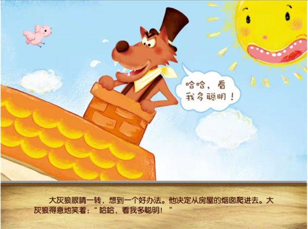 大灰狼眼睛一转,想到一个好办法。他决定从房屋的烟囱爬进去。大灰狼得意地笑着:“哈哈,看我多聪明!”