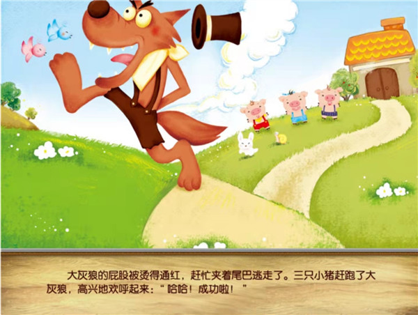 大灰狼的屁股被烫得通红,赶忙夹着尾巴逃走了。三只小猪赶跑了大灰狼,高兴地欢呼起来:“哈哈,成功啦!”