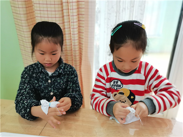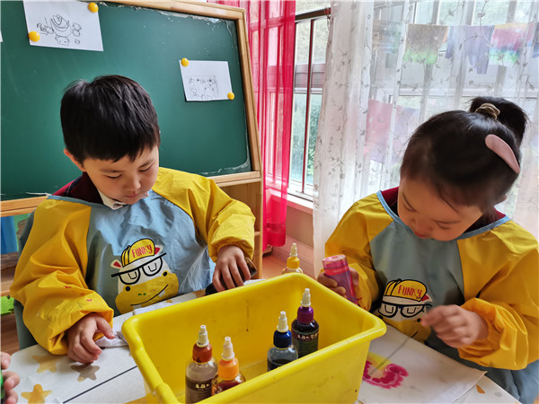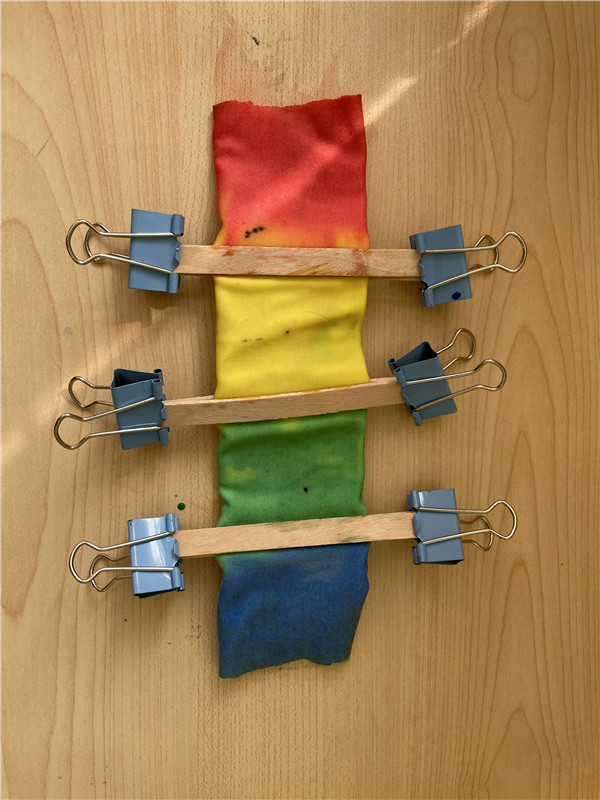 是染料倒多了吗?经过反复的尝试发现滴管染色比直接用染料瓶倾倒会减少染料滴到地上或是桌面上的问题,但是并没有解决混色问题。孩子们对此并没有放弃而是在积极寻找别的原因,终于他们将问题聚焦在了捆扎上。