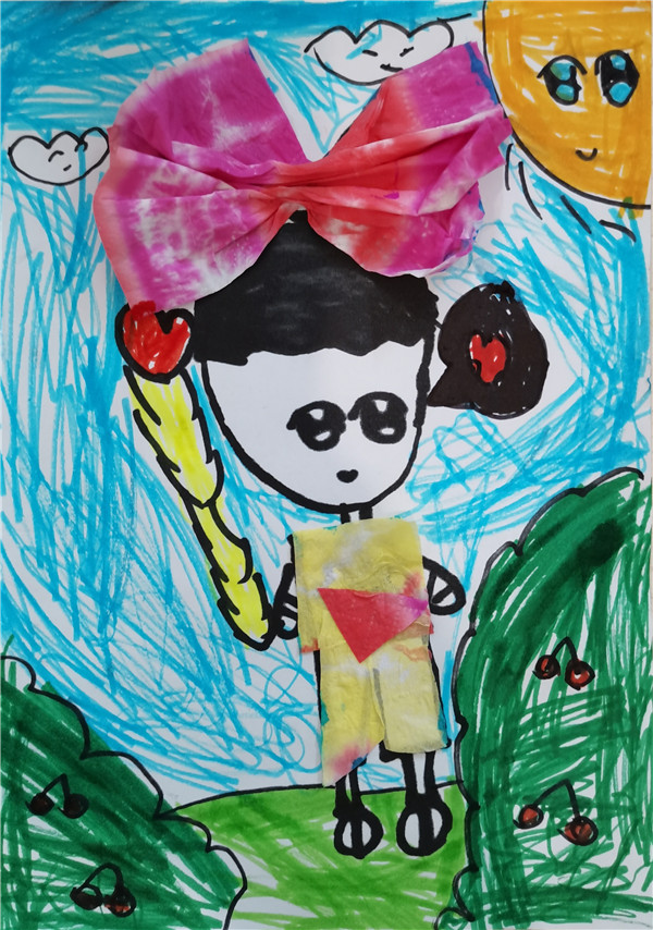 通过前期积累的经验,孩子们又有了更加大胆的想法,想要尝试扎染更加复杂且具有创意的作品,有小朋友提出通过先画设计图,然后根据设计图染。孩子们的设计受到前期扎染的影响,设计图偏简单,也为后来成功扎染奠定了基础。设计图被成功染出提升了孩子们对扎染的自信心,同时也激发出更强的探索欲。这时有小朋友发现晾晒区已经被晾晒满,刚染的也已经没有地方可以晾晒。怎么办呢?很的孩子想要把已经晾好的布再利用,于是就开始了创意装饰画。