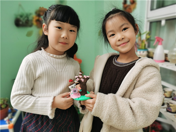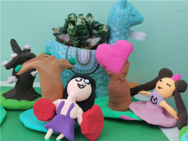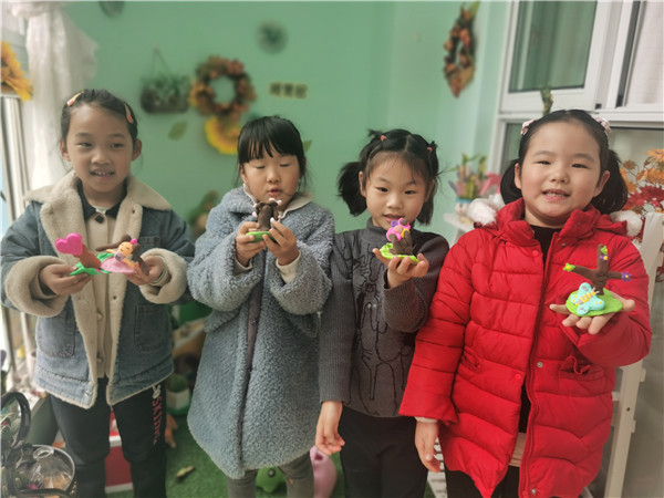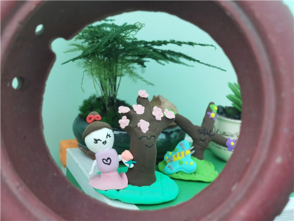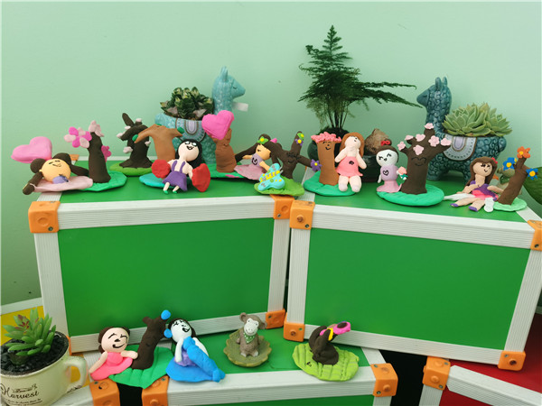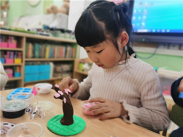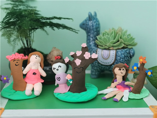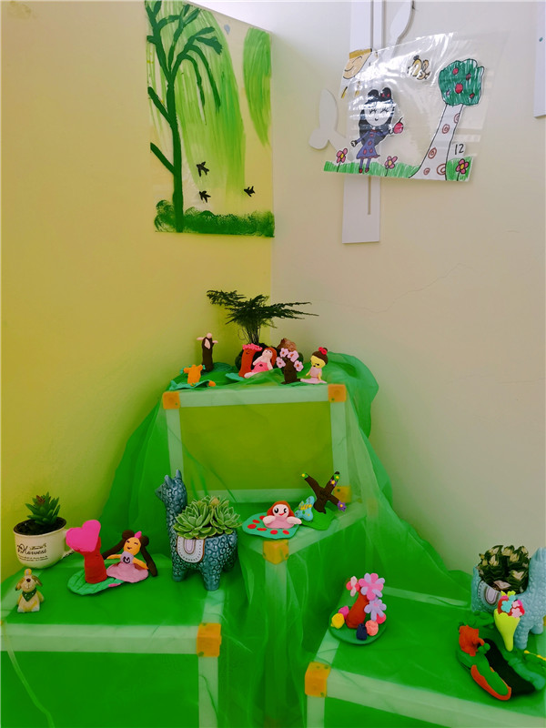 老师们引导孩子发现春天的秘密,参加种植活动,体验种子发芽的奇妙;观察春天的花,感受色彩的缤纷;借用散步、自由游戏的时间自主观察植物的特征、植物的变化,积累丰富的感性认识。而后,老师们鼓励孩子用黏土表现自己对春天的认识,小小粘土,创意无限,揉一揉,搓一搓,黏一黏,几块不同颜色的粘土,渐渐在孩子们的手中变成了一个个春天的定格场景,奇妙而又梦幻。垂柳换上了嫩绿的新装、桃花红着脸,抿着小嘴、好像在告诉我们春天来了,春天来了,小朋友们在樱花树下嘻戏,孩子们在天马行空的创意制作中,感受着春天的美好。
