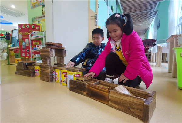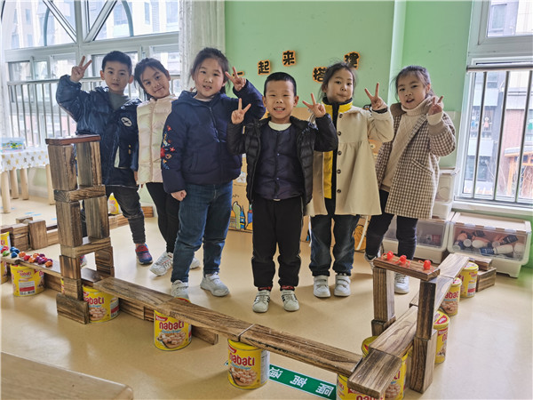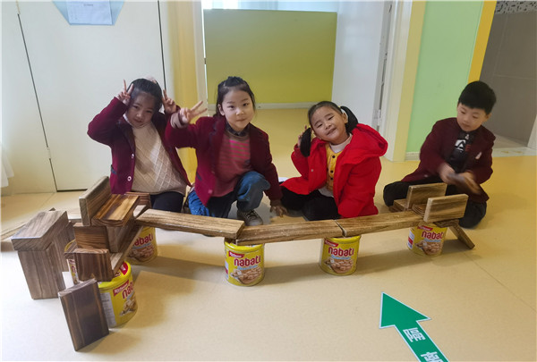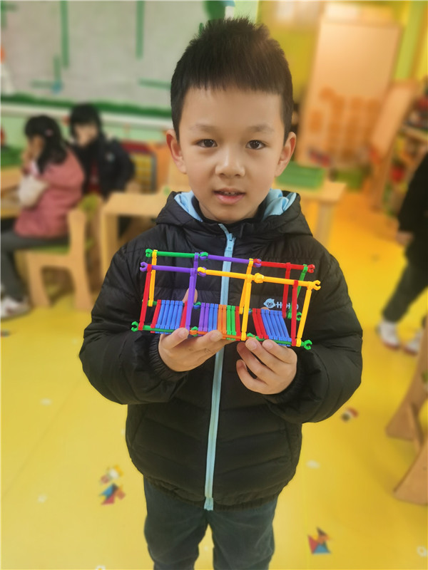 集体活动中孩子们结合已有经验,以及通过搜集资料认识了各种各样的桥,石拱桥、石板桥、斜拉桥、铁索桥、独木桥、立交桥,通过观察,孩子们了解了桥的组成:桥面、桥墩、护栏等。有了经验的铺垫,孩子们开始探索桥的秘密,几个孩子来到建构区商议要搭什么样的桥。鑫鑫说:“搭三层天桥吧,可以把几块木板拼接起来。”天天说:“还是搭独木桥吧,把桥面搭好就可以了。”若曦说:“搭铁索桥吧,把绳子的两端固定好就可以了。”通过讨论,最终决定搭“三层天桥”,碳化积木做桥面、饼干桶做桥墩,大家开始了分工合作、有的负责搬运木块、有的负责搭建、有的负责指挥,不一会的时间孩子们设计的“三层桥”竣工啦!孩子们在区角活动中,自由的探索桥的奥秘,在这个感知的过程中,让孩子体会到各式各样的桥给我们带来的方便。