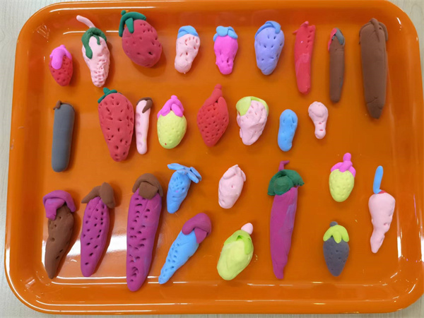 在团团、捏捏、搓搓中,孩子们慢慢掌握了玩泥的技巧。之后,孩子们很快便做出了草莓。