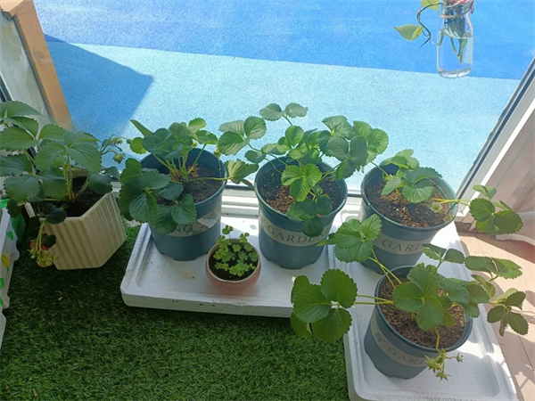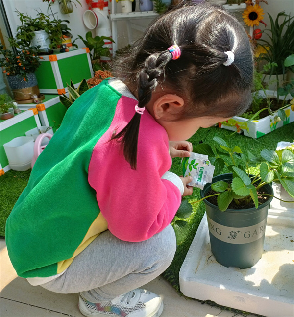随着草莓苗落户班级植物角,早上小朋友来第一件事就是去植物角看看草莓苗开花了吗?结果了吗?午饭后,一群小朋友围着植物角开始观察讨论。