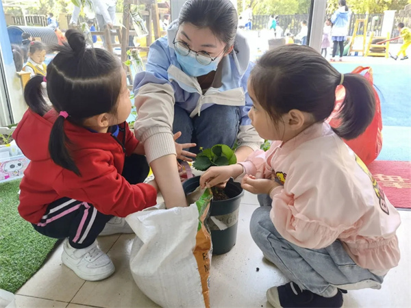 说干就干,在老师的辅助下,小朋友们捧土,浇水,不一会儿,草莓苗就安了“新家”。