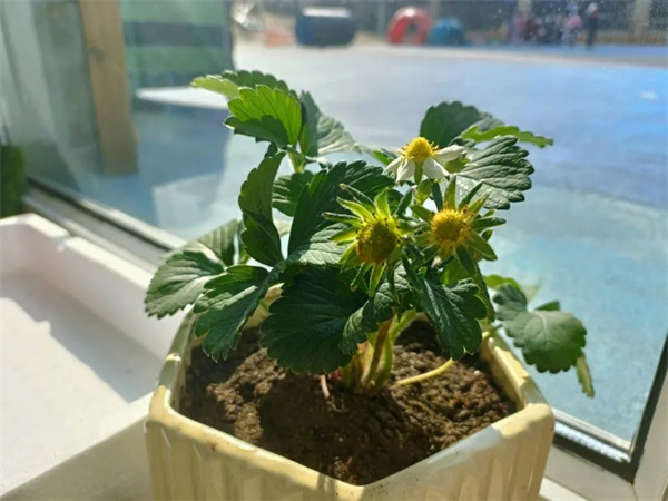 “这个绿植叫草莓苗,是老师从家里带来的,你们谁能来说一说你看到的草莓苗长什么样吗?”“叶子绿绿的,还有点像爱心。”“花有点像鸡蛋,有白色和黄色。”“那它会长草莓吗?我最喜欢吃草莓了。”“当然啦,但是首先我们要把它种在花盆里,你们看一看植物角的空花盆哪一个比较合适呢?”“选最大的花盆,因为我想让它结出大草莓。”