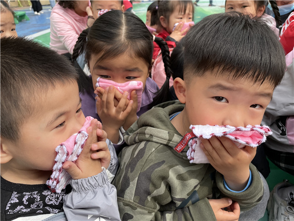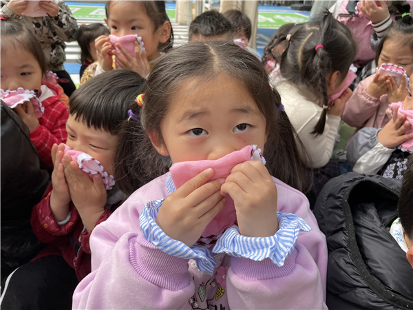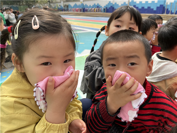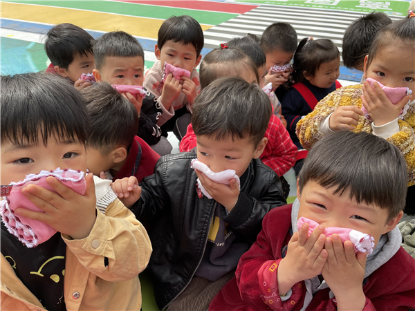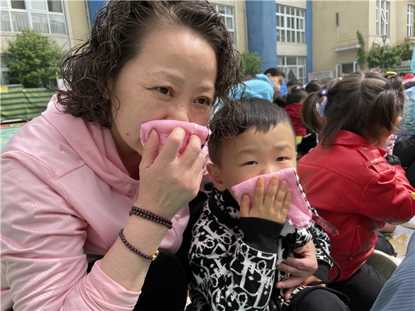 在活动开始前,班级老师带幼儿学习了火灾发生时逃生相关的应急知识。当老师问道:“小朋友们,教室着火了该怎么办呢?”幼儿们有的说要赶紧跑,有的说逃跑前要先用毛巾捂住嘴巴和鼻子,有的小朋友说没毛巾还要是湿的等等。老师为小朋友们进行了总结,同时现场为小朋友们演示了火灾发生时正确的逃生姿势。