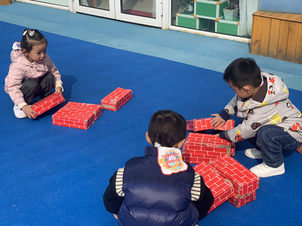 滑梯城堡的初次尝试给予了孩子们极大的满足感和成就感,他们通过自主探索、遇到问题、解决问题、合作完成了自己想要的作品,对孩子们来说,是一个非常宝贵的经验。他们兴奋地叫来班级的其他孩子欣赏他们的“滑梯城堡”,“这个有点小,没有操场上的大”,“也不能真的滑”,“我也想试试”。于是,第二次尝试开始了……