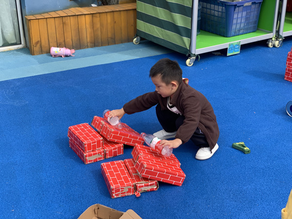 大家来到操场商量着选用哪些材料来玩。有纸盒、桶、垫子、奶粉罐、大型积木……大家纷纷行动起来,首先选择了纸盒,很快就搭好了。“我来试一试”