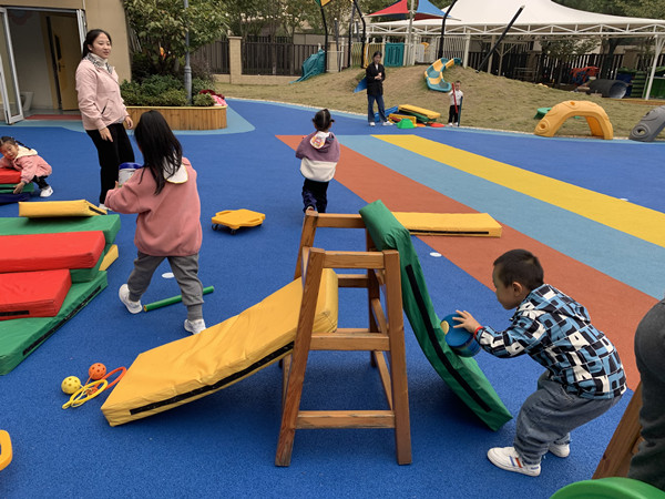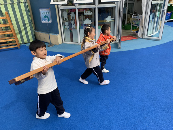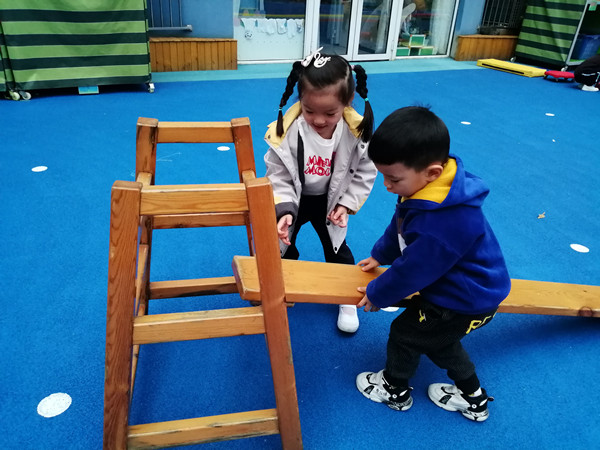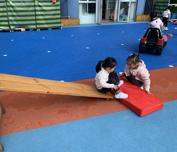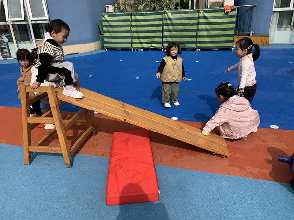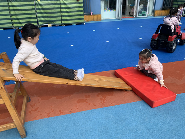 孩子们突然发现了旁边的“大木头”,“咦,那是什么?我觉得可以用它来搭滑滑梯,它比较硬看起来”。可是爬上去准备滑下来时,脚轻轻一踩,垫子就滑落了。
