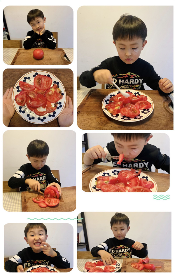 利用周末的时间宝贝们探索了许多生活中常见的蔬菜,还把这些蔬菜画了下来,带到了幼儿园和小伙伴们一起分享。宝贝们不仅是小小观察家,还化身为小医生和小厨师将蔬菜进行简单的“解剖”,观察蔬菜的内部到底是什么样子的,有的说黄瓜里面软软的,有的说卷心菜里面是白色、绿色,长得像面条,长长的。简单的解剖过后,小朋友们对蔬菜更感兴趣了,纷纷回家做起了蔬菜大餐。