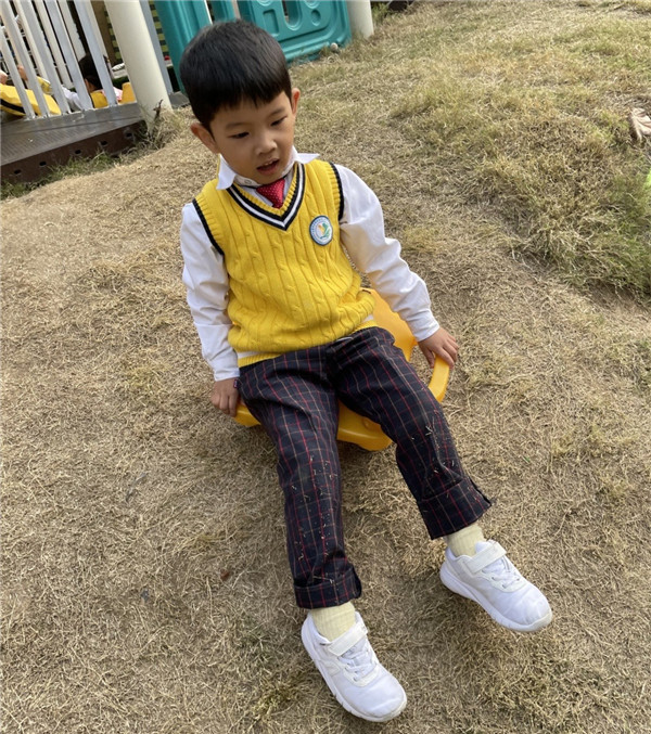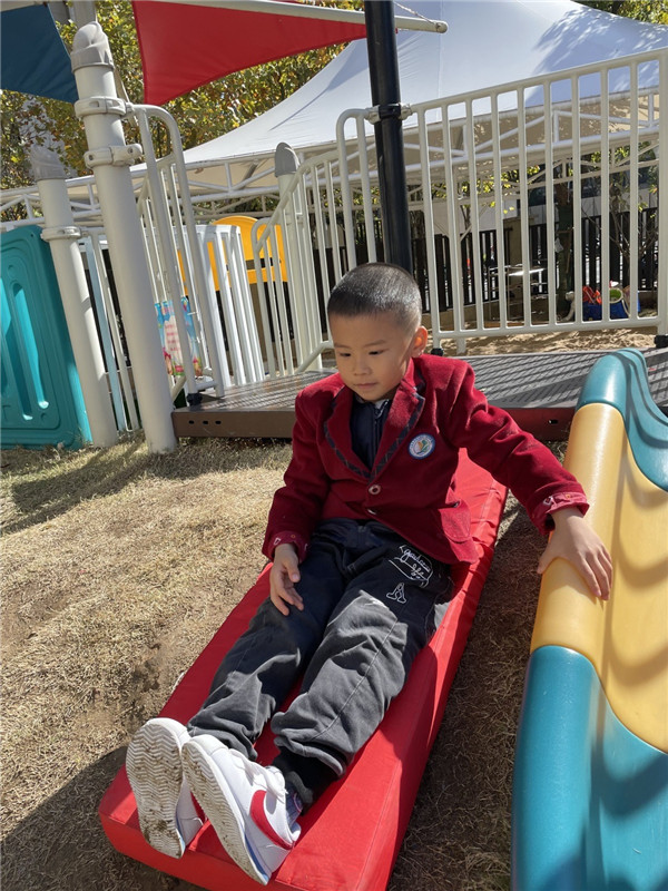 简单的滑行游戏,在幼儿的探索与大胆尝试下,产生了更多的乐趣,幼儿们善于发现,用身边一切看见的物品去探索新的玩法。皓皓在用四轮滑板车滑行之前,没有立刻滑下来,而是想到了用绳子来保证自己安全,这是他对未知危险的一种防范,在没有确定安全的情况下不会轻易的滑下去。在感知了滑板车滑行的速度之后,才大胆的释放放手和双脚,从山坡上滑了下来,这一刻,他的心情是无与伦比的喜悦,这是皓皓创造出新玩法的满足与自豪。