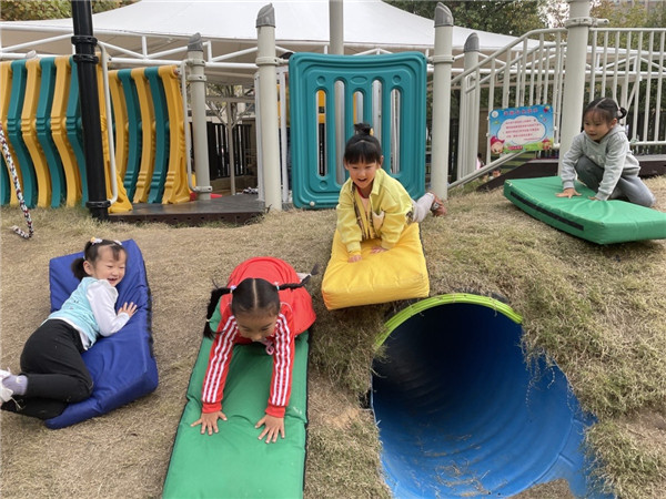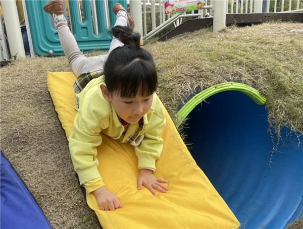 有了第一次的尝试,函函的胆量大了起来,她把垫子放在隧道的左上方,小身子朝着垫子上一扑,小脚一蹬,垫子“嗖”的一声就滑了下来,周围的小朋友看见了,纷纷围了过来,尝试新的游戏,玩的不亦乐乎。